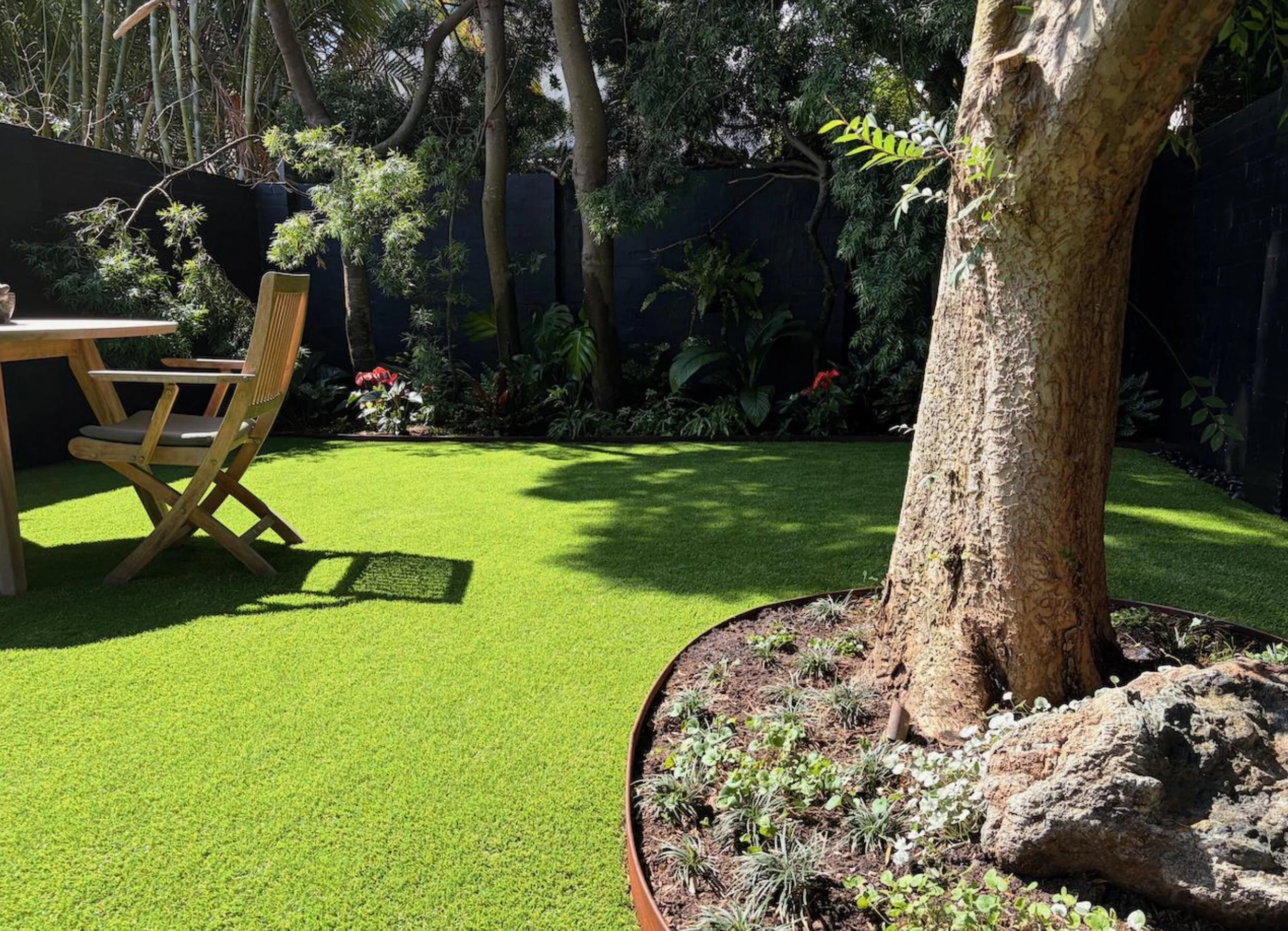 The garden had strong bones from the start. A mature canopy of Podocarpus elatus (Brown Pine) along the back boundary, a sheltered courtyard microclimate, dark-painted brick walls, and an AstroTurf lawn. Bondi's coastal sandy soils are nutrient-poor and require consistent organic matter replenishment to support anything beyond the most drought-tolerant planting — over five years we topped up soil biology in the beds periodically, keeping the system productive without overcomplicating it.