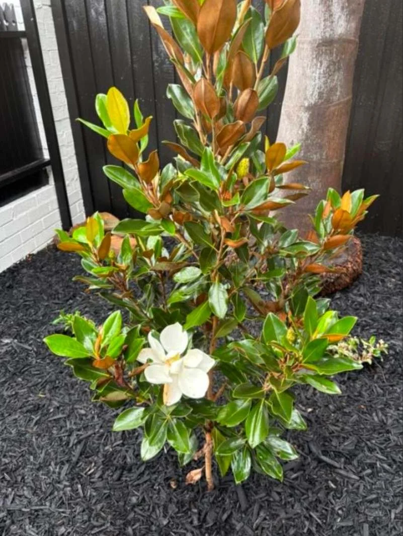 The planting palette was minimal and deliberate. A single Magnolia 'Little Gem' (Magnolia grandiflora 'Little Gem') was installed as the hero specimen — chosen for its compact upright form, glossy deep- green foliage with bronze undersides, and large white flowers that perform reliably in the dappled shade created by the existing palms. Tricolor Star Jasmine (Trachelospermum jasminoides 'Tricolor') was planted throughout as the understorey groundcover — its variegated cream, green and pink foliage providing year-round colour and texture without competing with the Magnolia.