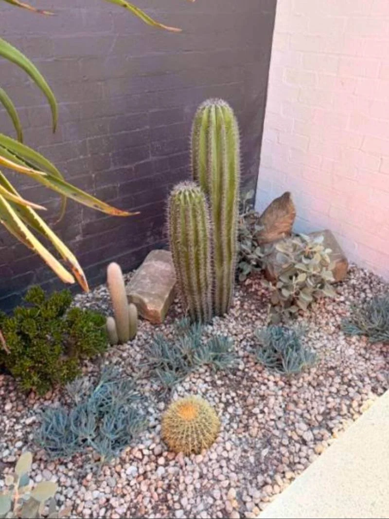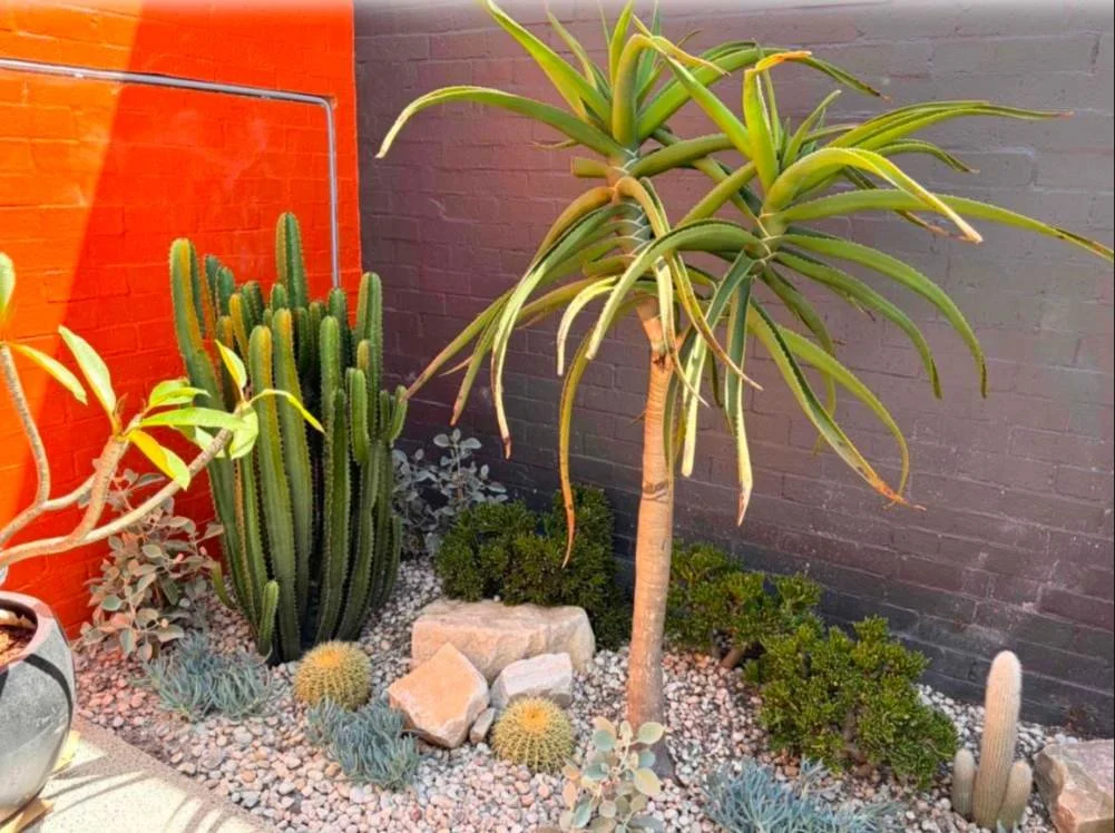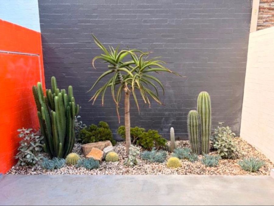 The planting palette was chosen entirely for drought tolerance, architectural form, and warm seasonal colour: Tree Aloe (Aloidendron barberae) as the centrepiece specimen, Mexican Giant Cactus (Pachycereus pringlei) and Cowboy Cactus (Euphorbia ingens) for bold vertical form, Silver Torch Cactus (Cleistocactus strausii) for fine-textured columnar interest, Golden Barrel Cactus (Echinocactus grusonii) anchoring the ground plane, Kalanchoe Silver Spoons for silver-grey foliage and orange flowers in season, and Blue Chalk Sticks (Senecio mandraliscae) as a low spreading groundcover.